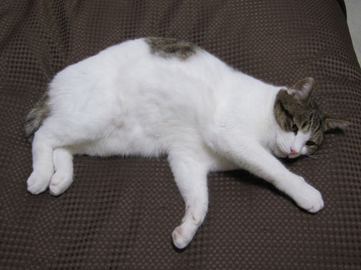 レオはよく夜私のベッドの上でゴロゴロしている。なんともうらやましい体勢。どうしてそんなかっこができるの?そりゃ猫だからだよね。